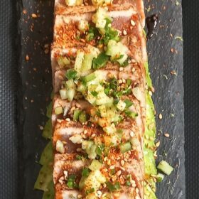 Sashimi Saumon snacké sur les 4 faces, présenté sur un lit d’avocats, agrémenté d’ une sauce Ponzu maison, huile d’olive, de shishimi, de sésame et d’une brunoise de cocombre.