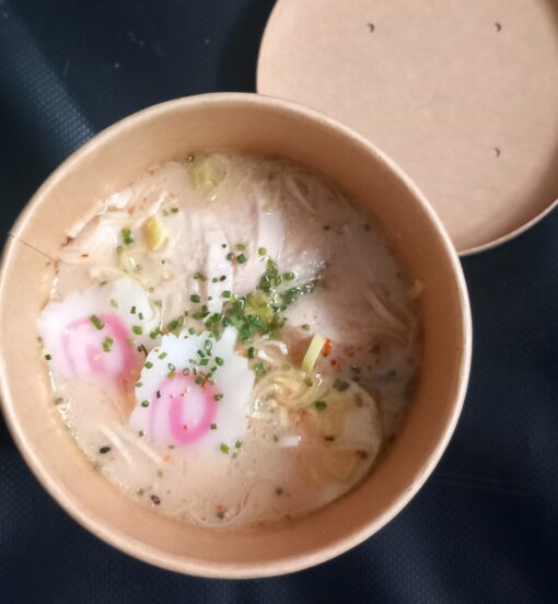 Noodles Ramen, oeuf mollet, Poulet mariné, Narutomaki, poireaux, shichimi,